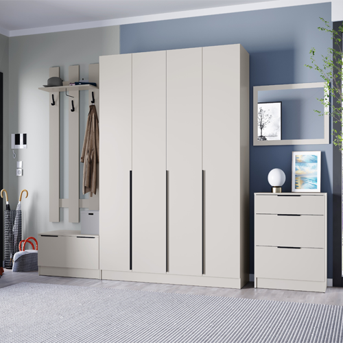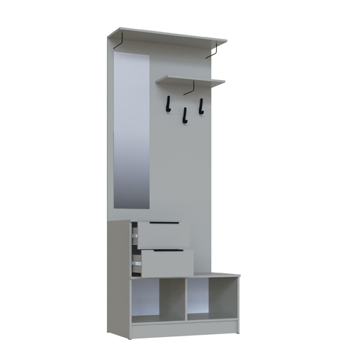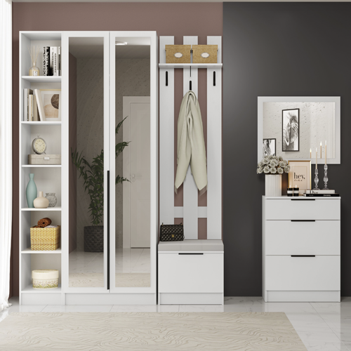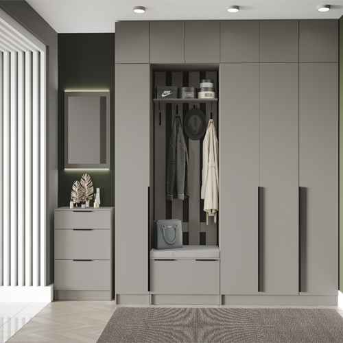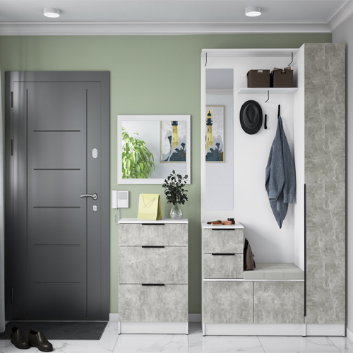 Прихожая «Мадрид» от фабрики ТЭКС — модульная система, которая позволяет создать функциональное и стильное решение для прихожей. Она включает различные модули: центральные секции, вешалки, тумбы, обувницы и другие элементы, которые можно комбинировать в зависимости от потребностей и размеров помещения.