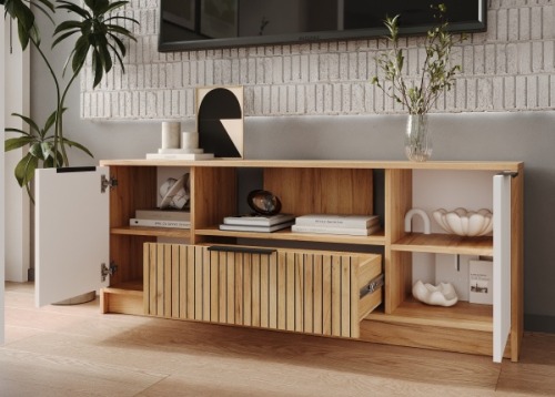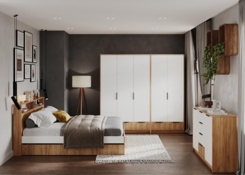 Ивис - комплект мебели для современной квартиры. Функциональные места для хранения, открытые полки и закрытые ящики позволяют разместить в спальне всё необходимое.